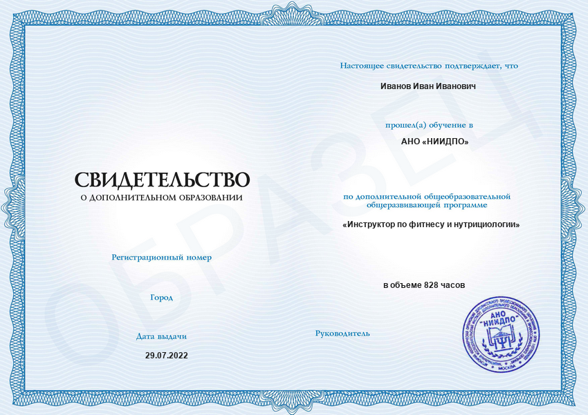Диплом о профессиональной переподготовке с присвоением квалификаций «Тренер по фитнесу» и «Фитнес-нутрициолог»