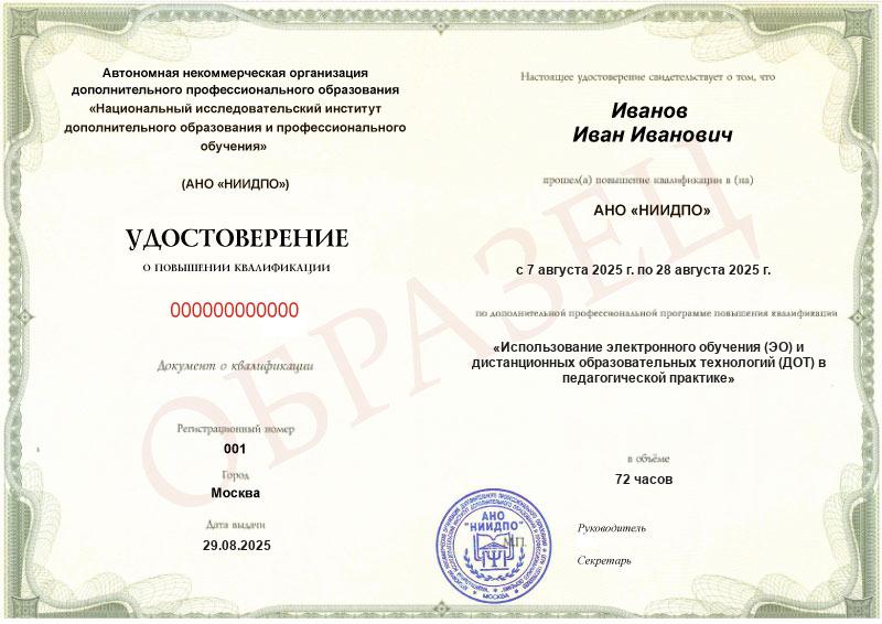 Да, документы оформляются на бланках с защитой от подделок, заполняются на русском языке, в них ставится печать АНО «НИИДПО».