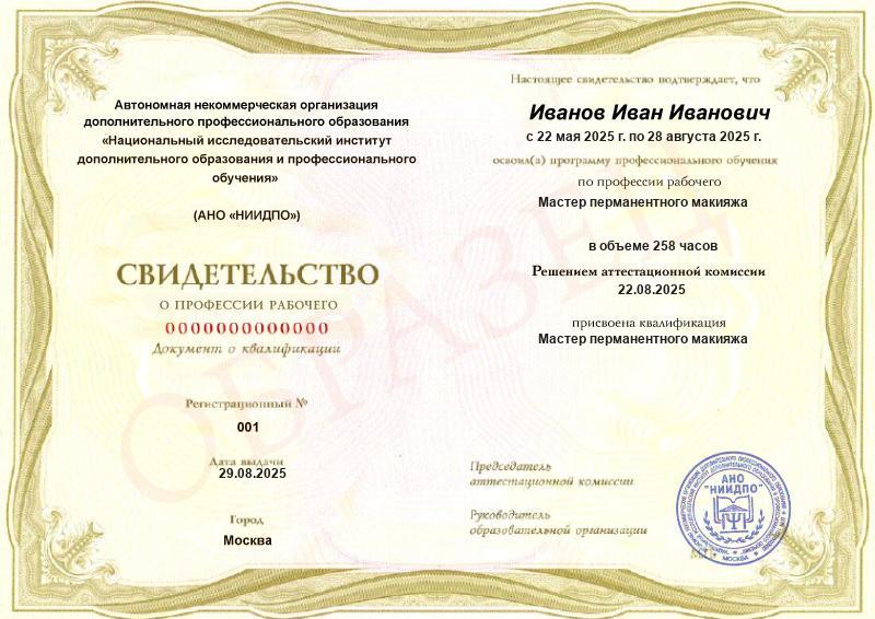 Обучающимся, завершившим обучение по основным программам профессионального обучения и успешно сдавшим квалификационный экзамен, выдается документ о квалификации – свидетельство о профессии рабочего или свидетельство о должности служащего, установленного образовательной организацией образца (в соответствии с Приказом Минпросвещения России от 26.08.2020 № 438).