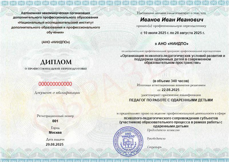 Сегодня в России в рамках проекта Минобрнауки «Наша новая школа» уделяется повышенное внимание развитию школ-интернатов для одаренных детей. Кроме бюджетных, создается множество частных или организованных при высших учебных заведениях школ. Все они ориентированы на создание психолого-педагогических условий для поддержки одаренных детей и адекватной реализации их творческого и интеллектуального потенциала. Педагоги, прошедшие курс профпереподготовки, способны эффективно работать в образовательных организациях для одаренных детей, способствуя их всестороннему развитию и реализации способностей. Выпускники смогут составлять программы обучения одаренных детей, оказывать им поддержку в становлении личности и вхождении в социум.