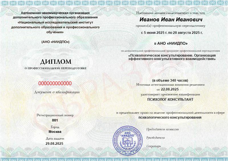 Здравствуйте. Проходила профессиональную подготовку в НИИДПО «Психологическое консультирование. Организация эффективного консультативного взаимодействия». Много интересной и полезной информации. Если, что-то не понятно, всегда готов прийти на помощь преподаватель. Обучение проходит в комфортной для себя обстановке и в удобное время. Для закрепления каждой темы, нужно проходить тестирование и выполнять практические задания. Жду диплом.