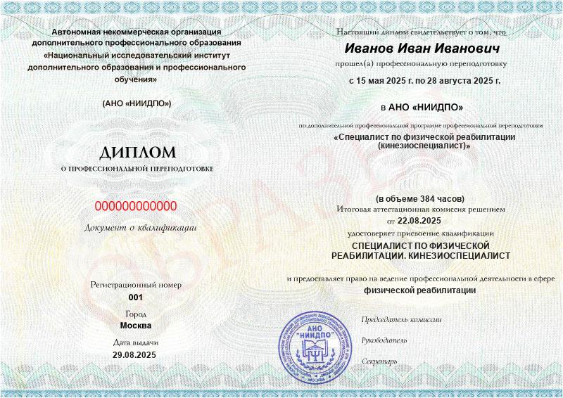 - Квалификация: Специалист по физической реабилитации. Кинезиоспециалист