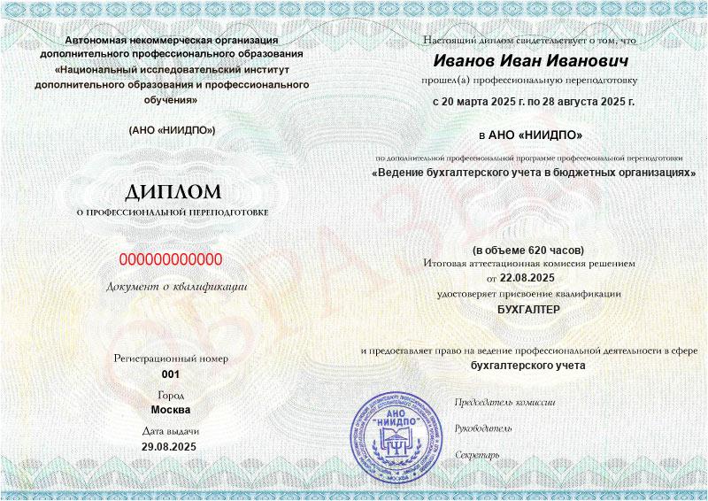 - Диплом с присвоением квалификации бухгалтера по программе дополнительного профессионального образования «Ведение бухгалтерского учета в бюджетных организациях»